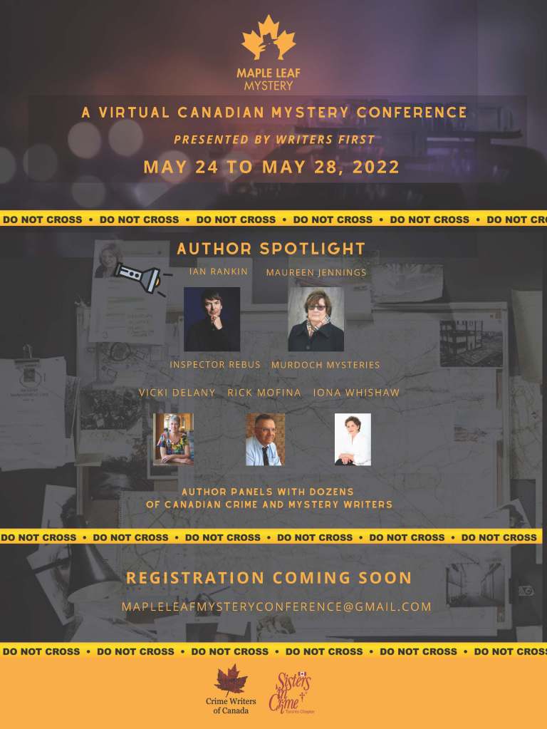 Announcing the virtual Maple Leaf Mystery Conference from May 24 to 28th. Registration is open and only $25 and if you register now, you may get a cool, free tote bag. Here’s the link: https://bit.ly/3KnlSzT