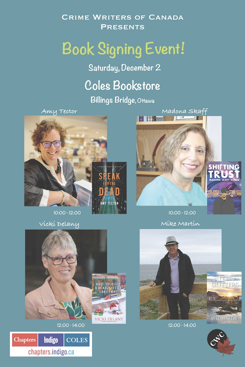 Mme Madona Skaff will be doing a book signing of her book Shifting Trust, a science fiction thriller, set in Canada and England. She will be at the Coles Bookstore at Billings Bridge, Ottawa, December 2nd from 10:00 am to 12:00 pm, joined by fellow authors, Amy Tector, Vicki Delany and Mike Martin.
