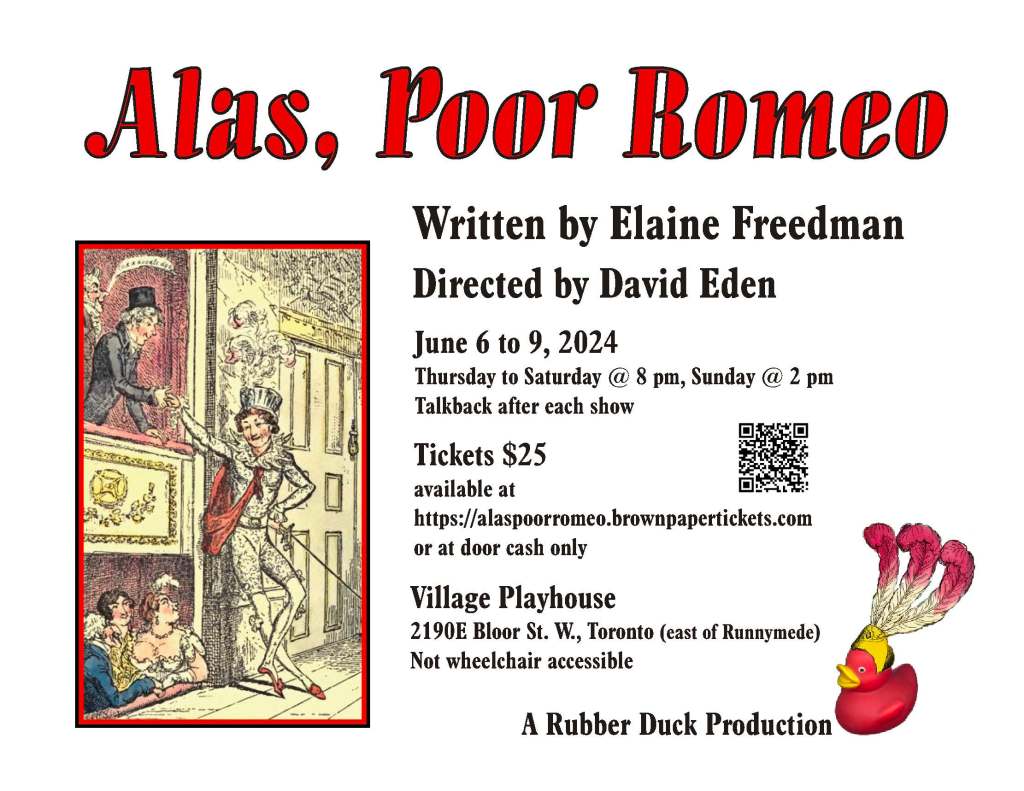 Mme Cheryl Freedman is a dialogue coach for Alas Poor Romeo, playing at the Village Playhouse, 2190 E. Bloor St. W., Toronto from June 6 – 9. Tickets are available at: