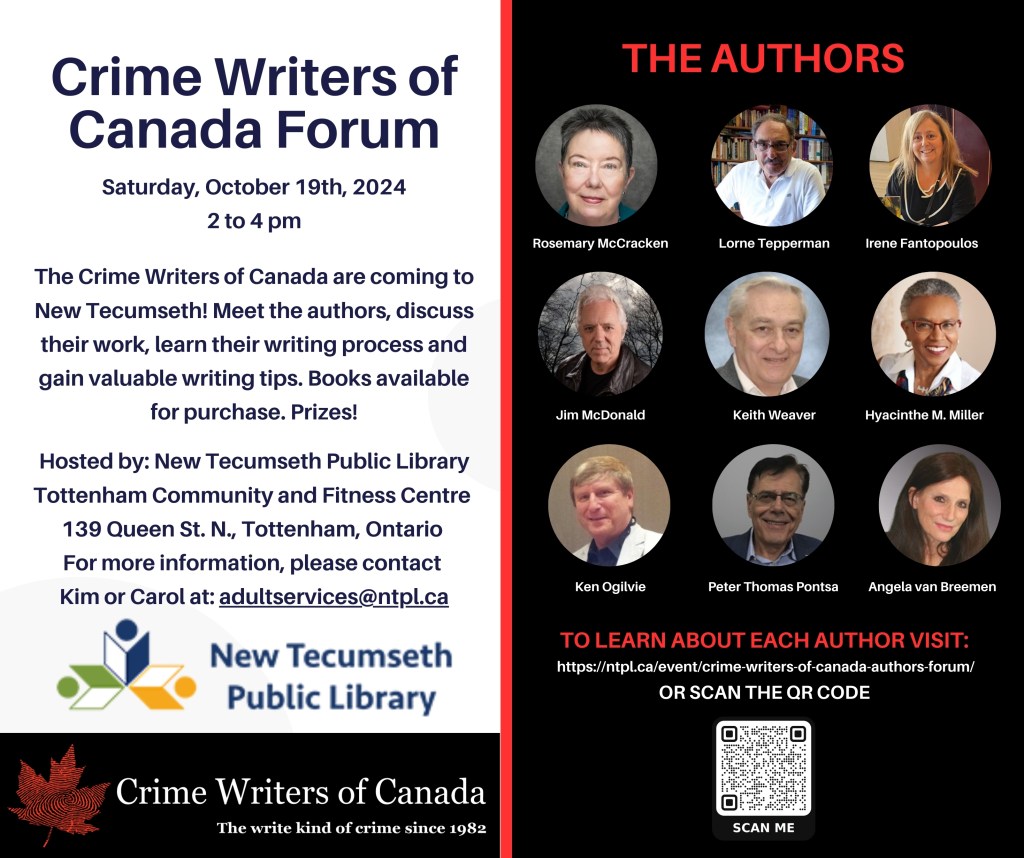 Mme Rosemary McCracken will be discussing crime writing with 4 other Crime Writers of Canada authors at the Tottenham Community Centre, 139 Queen Street North, Tottenham, Ontario. Saturday, Oct. 19, at 2 p.m.