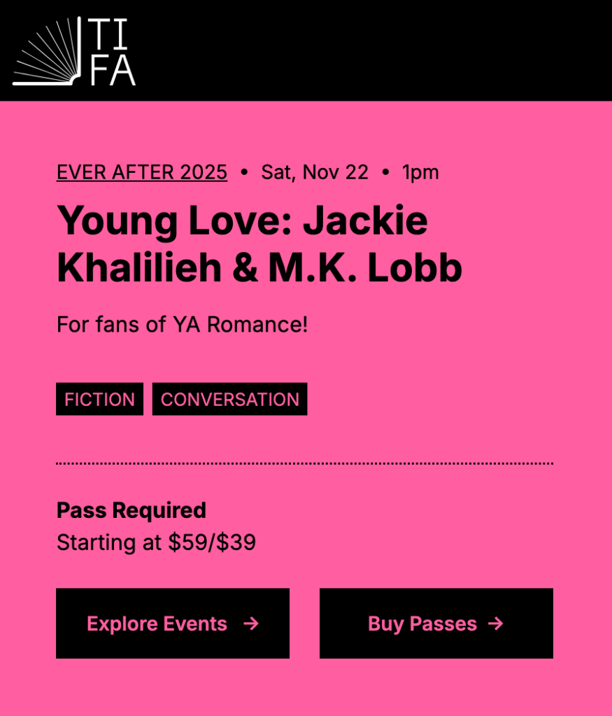 The Toronto International Festival Authors salutes romance writing. On Saturday, November 22nd, 1 pm, Mme Lisa De Nikolits will be moderating the panel on YA Romance with authors, Jackie Khalilieh and M. K. Lobb.
