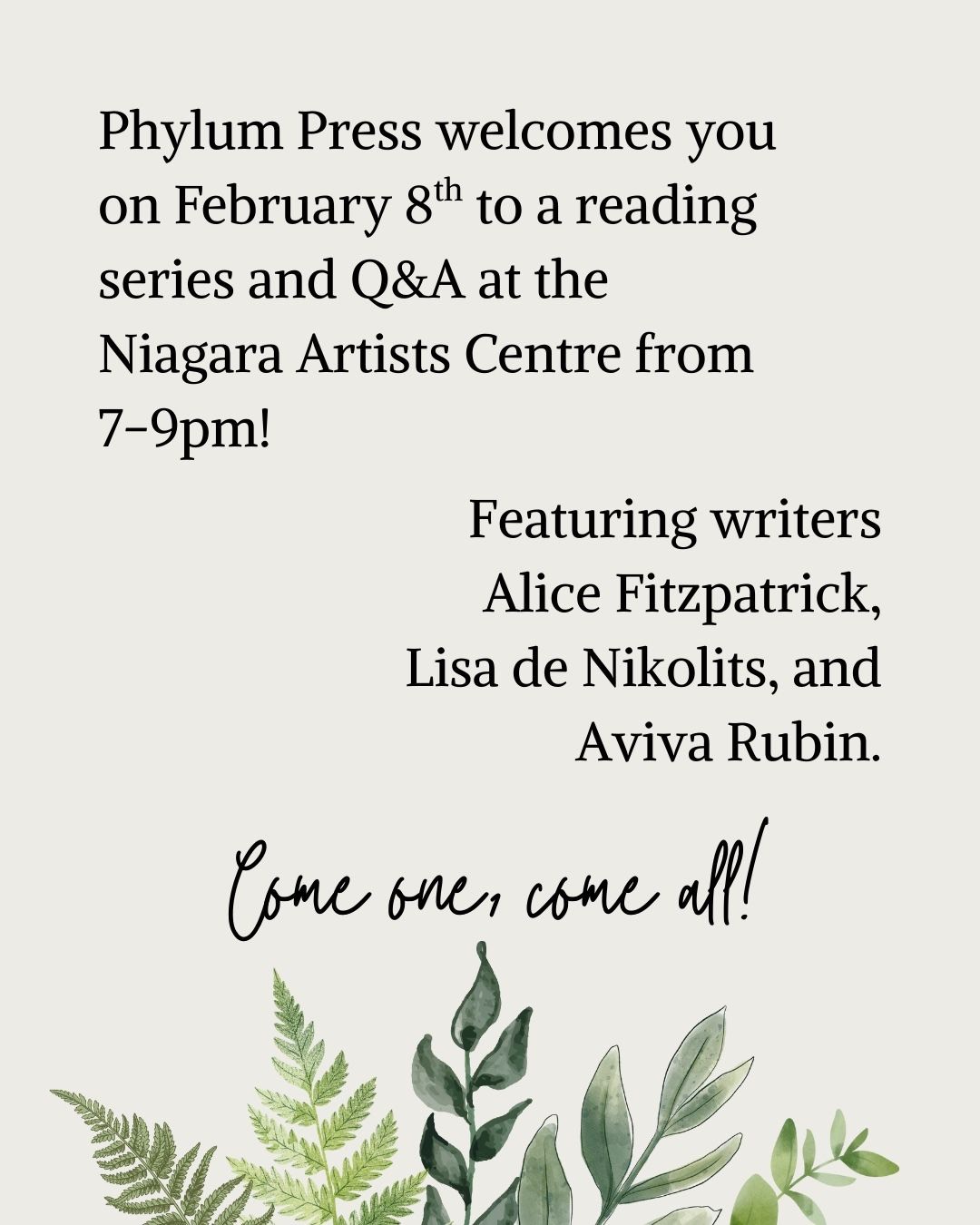 Mme Lisa De Nikolits will be one of the featured writers at the Phylum Press reading series and Q&A at the Niagara Artists Center, 354 Paul St., St. Catharines, on February 8 from 7 – 9 p.m.